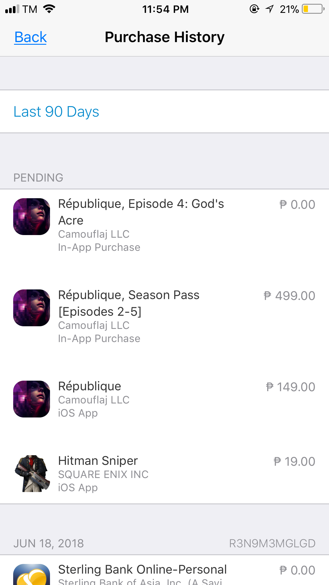 Your purchase history appears. When you get to the Account interface locate and tap on the Purchased option. Pending means it has not been charged to your bank account yet.